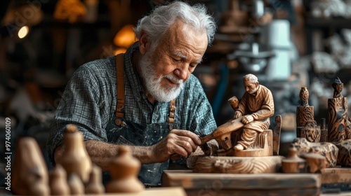 Elderly Woodcarver Working on Wooden Statue in Workshop