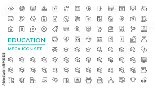 E-learning icon set. Online education icon set. Thin line icons set. Distance learning. Containing video tuition, e-learning, online course, audio course, educational website