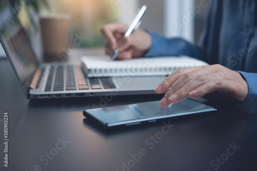 E-learning online study and work from home concept. Woman working on laptop computer using mobile phone and writing on notebook