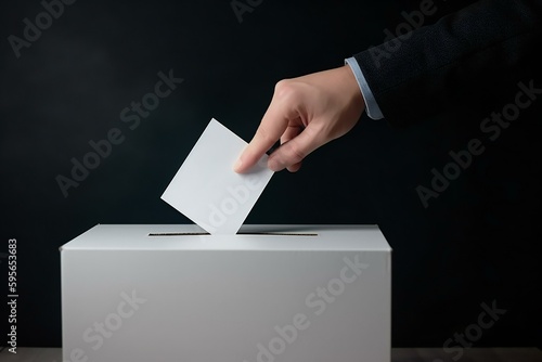Elections. Man casts her ballot at elections. Man casting vote. Ballot box. Generative AI.