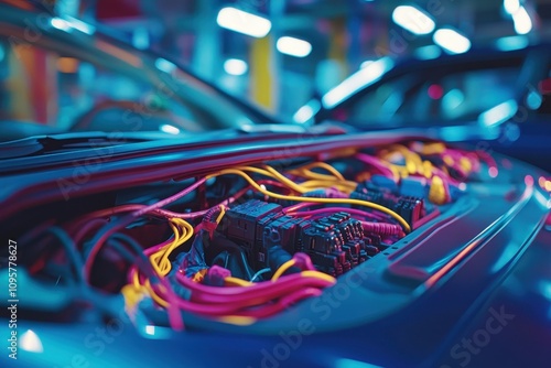Electric car engine close-up. Shows intricate wiring and components of an EV.