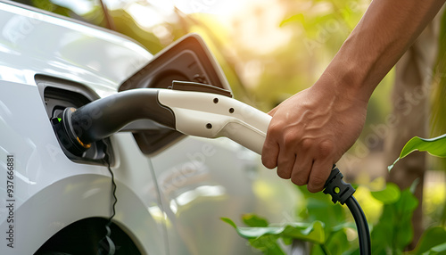 Electric car or ev is charging at station . man use the white power cable and plug on nature background