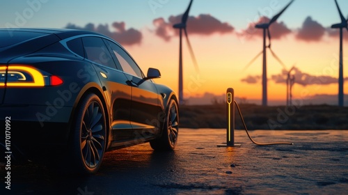 Electric car with a glowing charging plug, wind turbines and clear skies in the background
