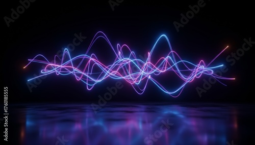 Electric Energy Flow, Interconnected Neon Lines in Vibrant Blue and Magenta Over Reflective Surface, Futuristic Abstract Art with Deep Digital Immersion.