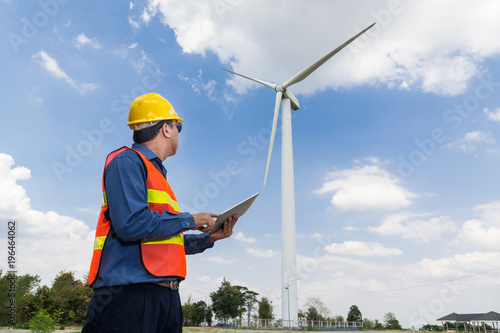 Electric Engineer use Tablet Device with Wind turbine power Generator Tower