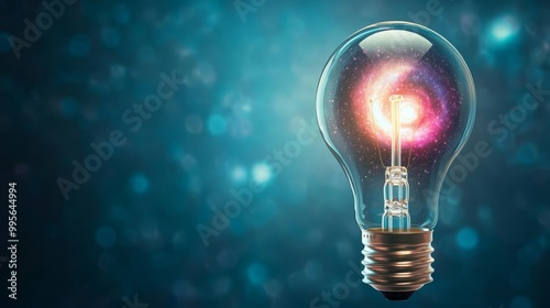 Electric light bulb with a galaxy swirling inside, ambient lighting creating a cosmic, space-inspired atmosphere, limitless potential