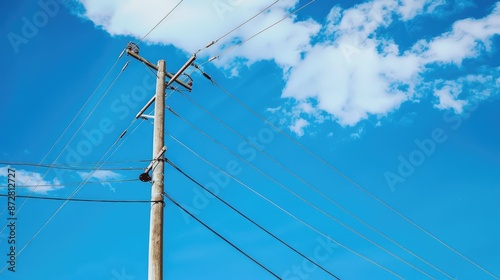 Electric lines against blue sky with hub on pole High voltage wires in background
