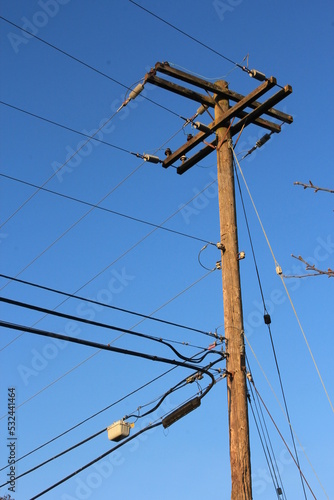 Electric poles made of wood against a dark blue sky scene. in America