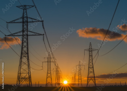 Electric power grid multiple towers and wires against sky blue background power generation Concept