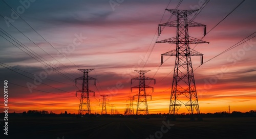 Electric pylons silhouetted against a vibrant sunset sky, symbolizing power transmission and infrastructure