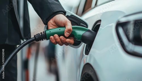 Electric vehicle charging at a station with a hand holding the charging cable.