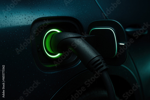 Electric Vehicle Charging Port With Glowing Connector In Rain