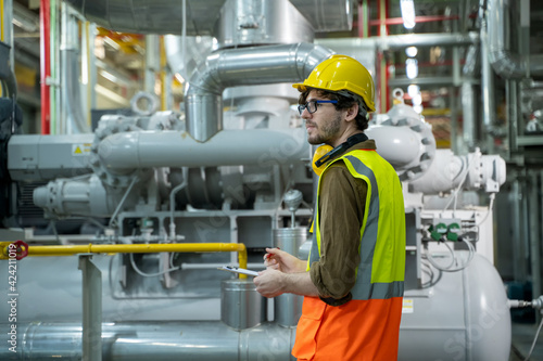 Electrical engineer checking and maintenance equipment condenser Water pump in electrical energy distribution substation at industry factory.