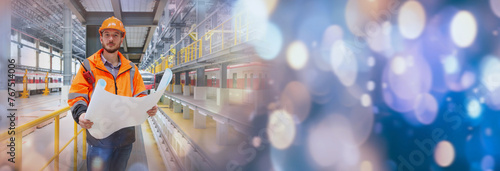 Electrical engineer railway in maintenance station using blueprint section electric train drawing checking construction process of electric train traffic important infrastructure. bokeh space for text