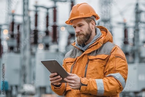 Electrical engineer wearing safety helmet and high visibility jacket using digital tablet while inspecting electrical substation, ensuring efficient power distribution