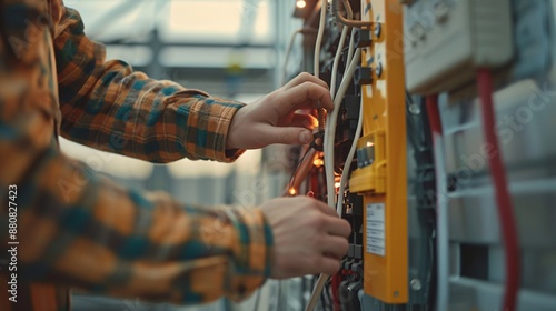 Electrical Installation Industrial Activities: Hands of a couple installing electricity connecting electrical cables on an electrical panel to turn on the building's electrical system, 8k resolution