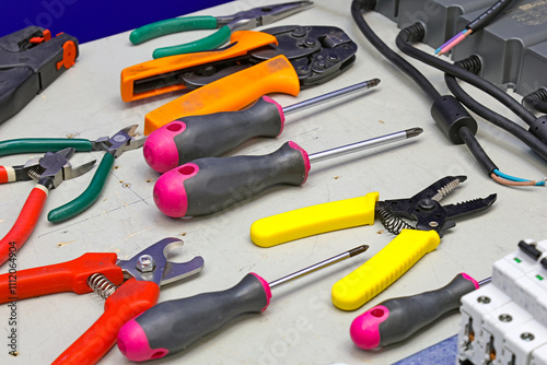 Electrical installation tools and materials for the assembly of electrical equipment. Soft focus. Close-up.