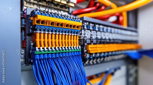 Electrical panel closeup with blue and orange wiring