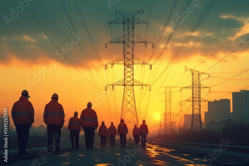 Electrical workers walking towards electricity pylons at sunset