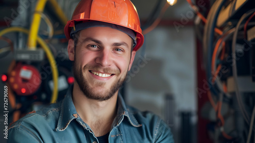 electrician at his workplace smiles to the camera