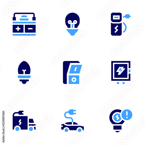 Electricity icon set. Bold style. Duotone colors. electric, charging station, light bulb, electric panel, light switch, truck, electric car, electricity