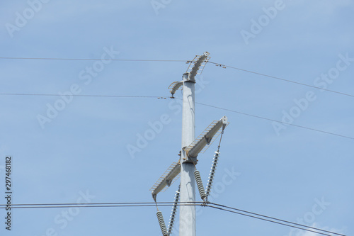 electricity pylon and power lines on background of sky