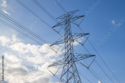 Electricity pylon silhouetted against blue sky wih cloud background. High voltage tower