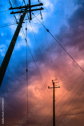 Electricity pylons and power lines and poles against the blue and red sky at dawn.