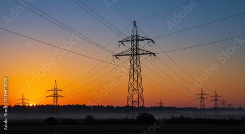 Electricity Pylons Silhouetted Against a Vibrant Orange and Blue Sunrise Sky