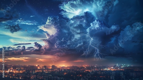 Electrifying Thunderstorm Over Nighttime City Skyline with Lightning Bolts and Electric Currents