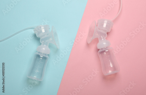 Electronic breast pump with bottles on blue pink background. Top view