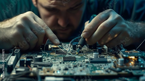 Electronic Circuit Repair - Close-up Images Of Hands Working On Circuit Boards. A Man Working On A Computer Chip, Showcasing Precision And Focus. Skilled Technician/Engineer Handling Components.
