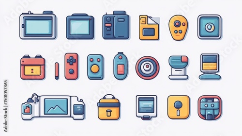 Electronic devices icons collection, variety of cameras, controls and more, flat design