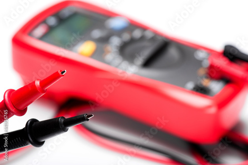 Electronic digital multimeter isolated on white with probes. Digital multimeter with red and black leads. Electronic multimeter isolated on white background close up