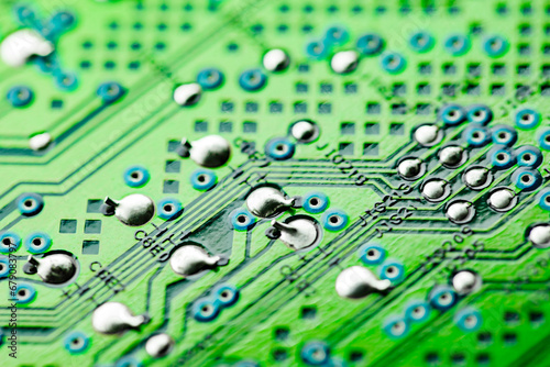 Electronic green printed circuit board with soldered copper contacts, holes, close-up, selective focus .