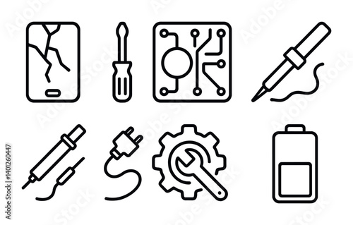 Electronic repair icons with tools and circuit symbols.