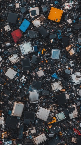 Electronic waste is scattered chaotically across the ground, highlighting the growing pollution problem