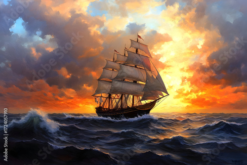 Elegant 19th century clipper ship sailing at sunset on the open sea