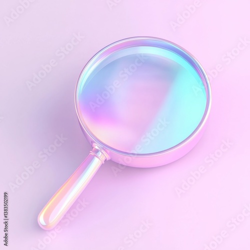 Elegant 3D glass magnifying glass icon with iridescent surface resting on soft pastel background