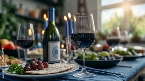 Elegant A candlelit Passover Seder table with elegant wine glasses traditional foods and a beautifully embroidered matzah cover