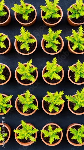 Elegant A tree nursery with rows of young saplings in pots ready to be planted bathed in soft morning light for Arbor Day preparation