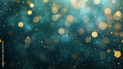Elegant abstract background featuring dark blue, gold particles, and Christmas light bokeh on a blue-green backdrop with gold foil