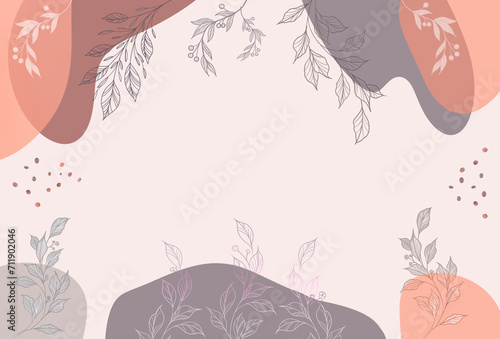 Elegant aesthetic floral birthday greeting card blank or wedding invitation mockup with frame from spots of abstract shapes. Flat lay. Free copy space.