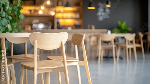 Elegant and Cozy Interior Dining Room with Wooden Chairs and Tables in a Light Design Cafe Space