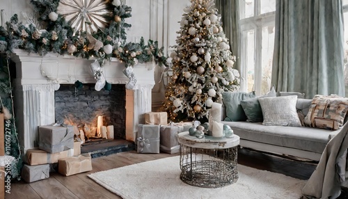 Elegant and cozy living room interior featuring a beautifully decorated Christmas tree and a glowing fireplace. Festive decor adds charm and warmth, creating the perfect holiday atmosphere.