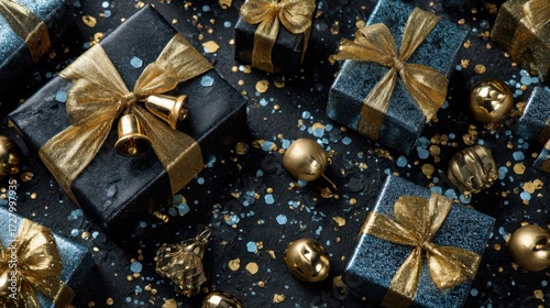 Elegant and Festive Christmas Gift Wrapping with Black, Gold, and Blue Presents, Bells, and Glittering Decorations for Holiday Celebrations