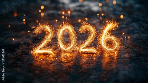 Elegant and luxurious 3D gold text for 2026, featuring a contemporary festive design with abundant lighting, glitter, sparkles, and a celebratory vibe, ideal for New Year's and anniversaries