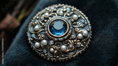 Elegant antique brooch featuring intricate floral design on dark fabric background