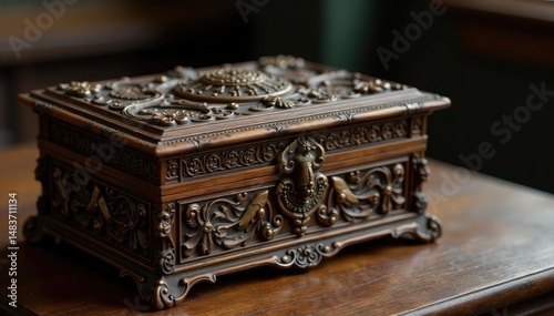 Elegant antique jewelry box, intricately carved wood, ornate details, vintage style , antique, pattern