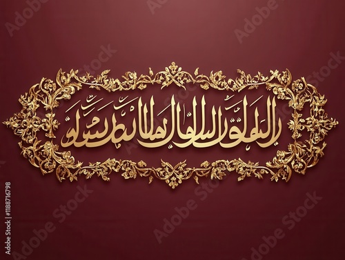 Elegant Arabic Calligraphy Design with Golden Ornate Frame on Maroon Background Islamic Art.